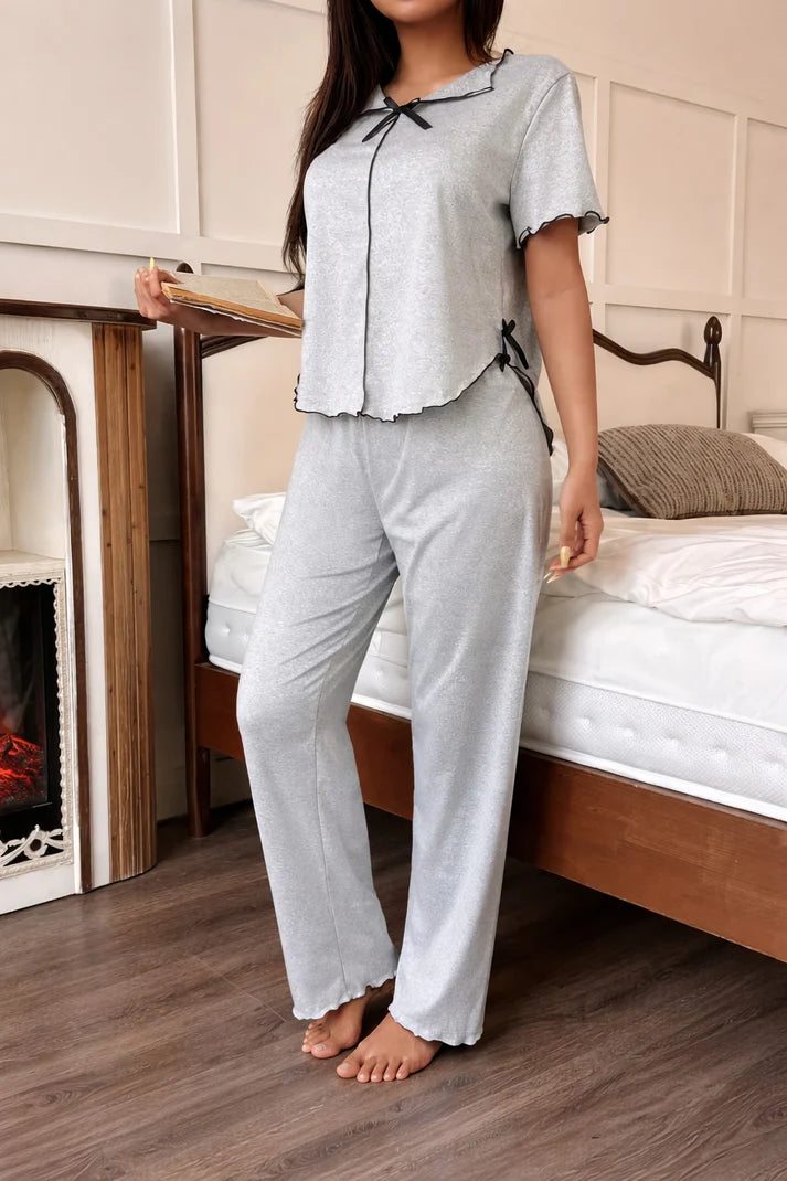 (New) hezel grey Collar with black bow half sleeves night suit The Ultimate Dream Wear Sleep Suit (OM-1170)