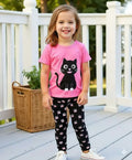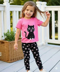 Pink With Black Cat Printed Half Sleeves T-shirt With Black and White Dotted Pajama The Ultimate Kids Sleep Suit (OM-387)